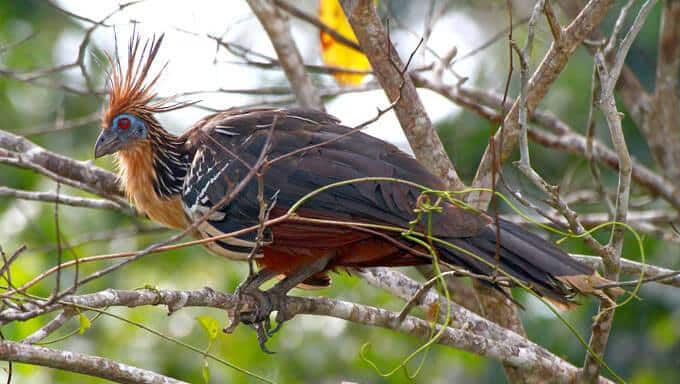 إن الطيران بالنسبة له مهمة ثقيلة أبداً، فهو يرتفع بصعوبة ويصدر صيحة يائسة مع كل خفقة بجناحيه وبعد طيران قصير غير واثق يصطدم بشجرة حيث يتخبط في الدغل بحثاً عن مكان يحط عليه، والأسوأ من ذلك أن له رائحة كريهة يستخدمها كوسيلة دفاع رئيسية ضد أعدائه .